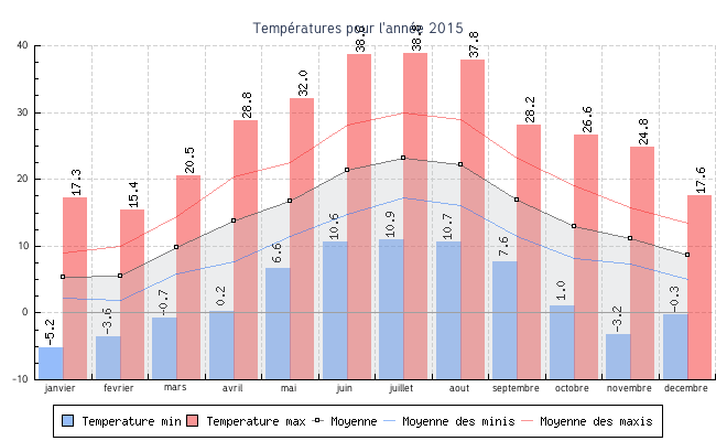 | Mois | Températures min | Températures max | Moyenne mensuelle |